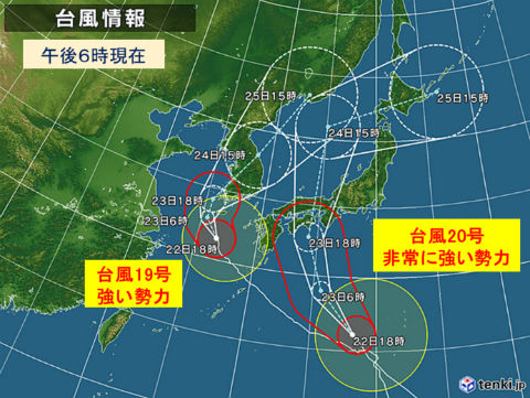 先に接近している台風19号の影響で、九州北部地方は既に影響が出ています。台風20号が北上し、四国ではあす23日昼ごろから局地的に雷を伴った猛烈な雨の降る恐れがあります。台風本体の雨雲がかかる23日午後は次第に近畿地方や中国地方でも雨や風が強まります。最新の進路予想の中心を進むことになれば、23日夕方から夜遅くにかけて四国地方に最も接近し、上陸する恐れがあります。