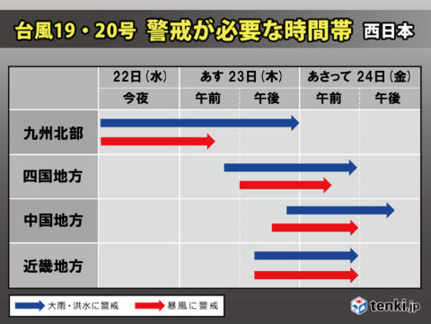きょう22日正午、日本の南の海上の台風20号が「非常に強い」勢力になりました。今後、台風はほぼ勢力を維持した状態で、あす23日からあさって24日に西日本にかなり接近し、上陸の恐れがあります。エリアごとの警戒時間帯、予想される雨や風の強さを確認しましょう。