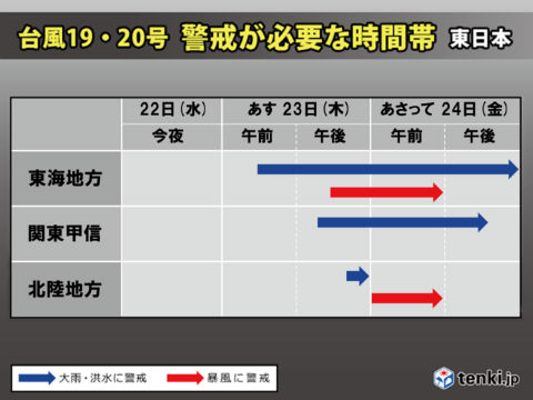 台風の北側の雨雲がかかり、東海ではあす23日の午前中には雨脚が強まり始めます。台風の予想進路の東側にあたる関東も非常に湿った空気が流れ込み、午後は甲信地方や関東地方の山沿いを中心に激しい雨の降る所がありそうです。台風がかなり接近するのは、東海地方に23日夜のはじめ頃から24日明け方に、北陸地方24日未明から朝にかけてです。ただ、台風が通過した後も湿った空気が流れ込み、所々で活発な雨雲がかかります。