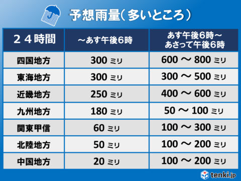 あす23日午後6時までに予想される24時間雨量はいずれも多い所で四国地方と東海地方で300ミリ、近畿地方で250ミリなどです。また、あさって24日午後6時までに予想される24時間雨量はいずれも多い所で四国地方で600ミリから800ミリ、近畿地方で400ミリから600ミリなどとなっています。特に雨量が多くなる傾向なのが、四国山地や紀伊山地などの南東側斜面で、台風19号からの雨量を合わせると局地的に総雨量が1000ミリを超え、土砂崩れや川の氾濫などの危険性がかなり高くなる恐れがあります。