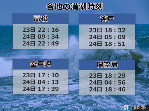 沿岸部にお住まいの方は満潮時刻を中心に高潮や高波による越波(えっぱ)や道路冠水などに警戒して下さい。