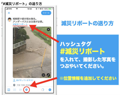 ウェザーニューズ(@wni_jp)では3月からユーザー参加型のプロジェクト「減災リポート」を展開しており、Twitterも協力しています。Twitterでハッシュタグ「#減災リポート」と位置情報をオンにして、被害状況をツイートするとマップとリスト上に反映され、どこでどのような災害が起きているかといった状況をリアルタイムに把握できるとしています(※被害状況を撮影する際は、身の安全を確保した上で)。