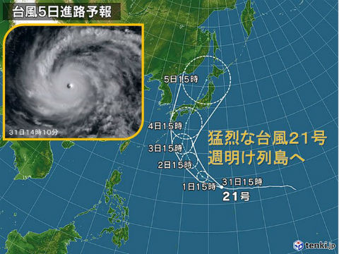 台風21号は「猛烈な」勢力に発達しています。1日(土)に発達のピークを迎えそうです。4日(火)から5日(水)にかけては列島へ接近、上陸の恐れがあります。