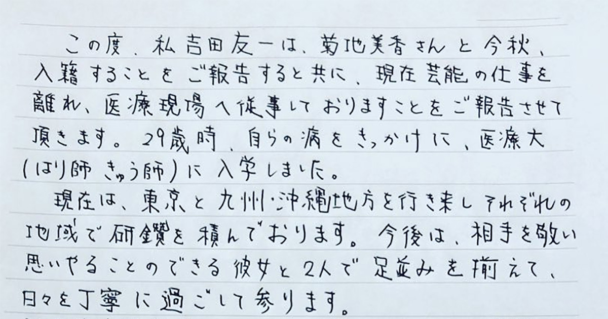 一方、吉田さんも自身のInstagramに直筆コメントを投稿し、その中で「この度、私 吉田友一は、菊地美香さんと今秋、入籍することをご報告すると共に、現在 芸能の仕事を離れ、医療現場へ従事しておりますことをご報告させて頂きます」と報告。吉田さんによると、29歳のときに医療大(はり師 きゅう師)に入学し、現在は東京と九州・沖縄を行き来しながら研さんを積んでいるそうです。