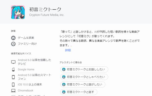対応デバイスは、Google Home、Android5.0以降のスマホ、iOS 10.0 以上の端末。初音ミクが日常に寄り添う生活……今後のアップデートも楽しみです。