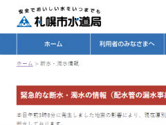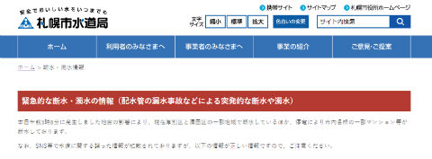 札幌市では全市が断水するといううわさが流れましたが、市水道局はWebサイトで断水エリアの情報を公開し、「SNS等で水道に関する誤った情報が拡散されております」と注意を呼びかけています。