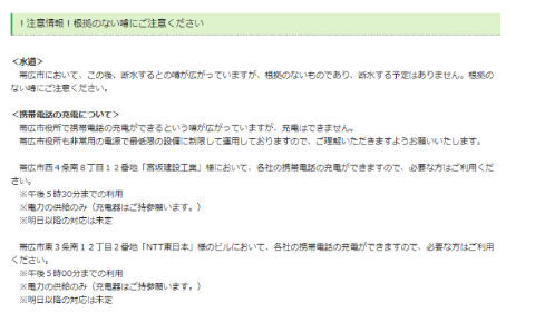 また帯広市では「この後、断水するとの噂が広がっていますが、根拠のないものであり、断水する予定はありません。根拠のない噂にご注意ください」とサイトに記しています。また市役所で携帯電話の充電ができるといううわさも流れており、これについても充電はできないと否定しています。