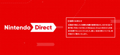 任天堂は9月6日に北海道で発生した地震を受けて、7日に予定していた「Nintendo Direct 2018.9.7」の放送を延期すると発表しました。