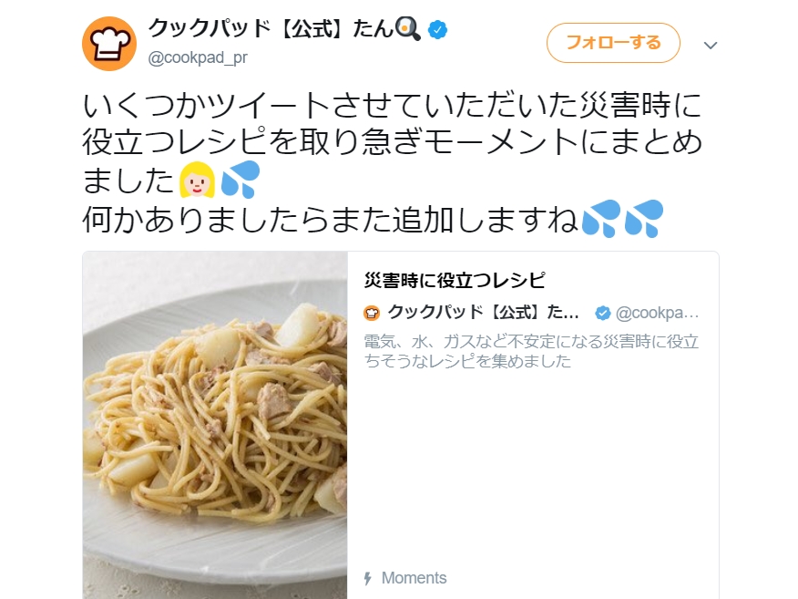 ツイートはモーメントにまとめられ、リンクにアクセスするとサイト上で詳しいレシピが見られるようになっています。クックパッドは公式Twitterで「大きな地震がありとても心配です。みなさま大丈夫でしょうか」と被災した地域のことを気遣いつつ、投稿したレシピについて「何かありましたらまた追加しますね」としています。
