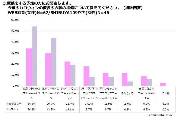 「ハロウィーンの衣装の準備」は、首都圏女子・109女子ともに「お店で市販のコスチュームを買う」「通販で市販のコスチュームを買う」「持っている服でコーディネートする」の順番。今年のハロウィーンも、思い思いの仮装を楽しむ女子たちの姿が見られるかもしれません。