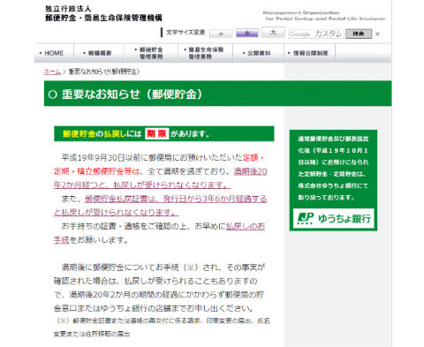 郵便貯金・簡易生命保健管理機構の重要なお知らせ