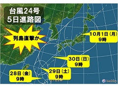 台風24号は予報円のほぼ中心を進むと、30日(日)ごろには奄美地方に近づき、速度を速めながら西日本にかなり接近するおそれがあります。その後、日本列島を沿うように進みながら10月1日(月)には東日本に達する見込みです。