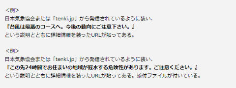 迷惑メールは同協会やtenki.jpからの発信を装い、「台風は最悪のコースへ。今後の動向にご注意下さい」「この先24時間でお住まいの地域が冠水する危険性があります。ご注意ください」などの説明と、詳細情報を装ったURLが貼られていたり、添付ファイルがついていたりするとのこと。