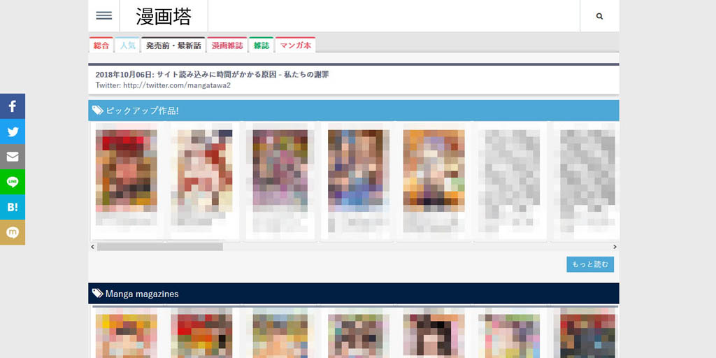 同サイトは「漫画村」の後継をうたっており、サイトデザインなどは「漫画村」に酷似。漫画雑誌や単行本など数千冊がアップロードされており、誰でも無料で閲覧できる状態になっていました。公式Twitterの発言を見ると、10月4日に「フリーブックスや漫画村の代わりになる漫画無料サイトを紹介!! 漫画塔!!!」、5日に「速報!漫画村が漫画塔としてして復活さたよ」(原文ママ)といったツイートを投稿しており、少なくとも4日の時点で既に存在していたと推測されます(ツイートはどちらも現在は削除済み)。