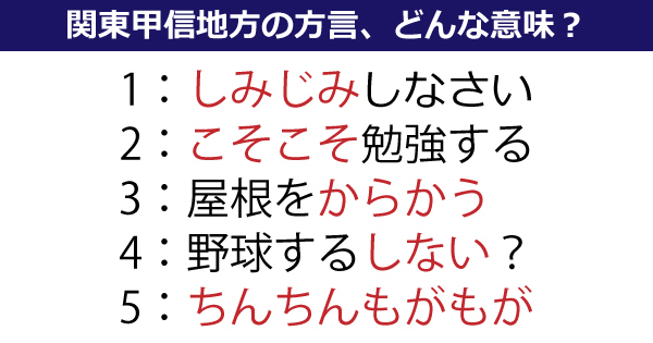 今回は東京都、栃木県、群馬県、埼玉県、茨城県、千葉県、神奈川県、長野県、山梨県の「関東甲信地方の勘違いされそうな方言」を中心にクイズ形式でまとめてみました。他地域の人が問題を見ると、きっと別の意味が頭に浮かんでしまうはず。