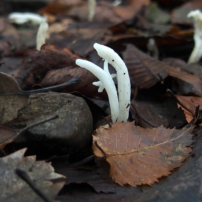 画像をよく見ると白く細長いキノコの真ん中から小さな手のようなものが生えていて、確かにその形状はニョロニョロそっくり。このキノコは「シロソウメンタケ」と呼ばれるもので、一般的なキノコとは違い、カサや柄といったものがないのが特徴。束状に群生している様子もニョロニョロ感をアップさせています。