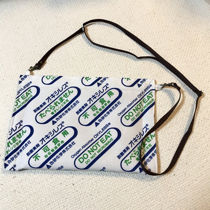 オリジナルの生地が1mから作れる&買える&売れるウェブサービス「HappyFabric」で脱酸素剤風の生地が販売されていたことに着想を得て、サコッシュバッグを作成しました。