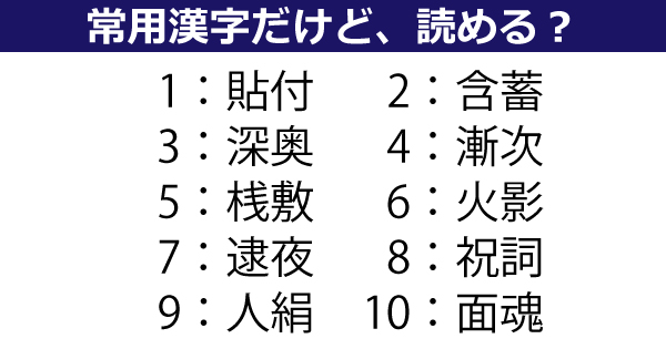 常用漢字なら誰でも読めるだろう……と思うかもしれませんが、実はそんなことはありません。今回は常用漢字表に掲載されている中で、「これは読めない」「読めるけど意味が分からない」というものを集めてみました。全問正解できた方は漢字博士を名乗っても良いでしょう。