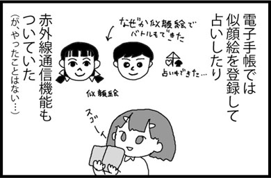 電子手帳には友達や家族の似顔絵を登録して、占いをして、ペットを育てて遊んでいました。たまごっち感覚。もちろん辞書ツールなどの勉強要素もあったけどあまり使った記憶がありません……。とはいえ、そうした電子手帳の持つ勉強要素は、親にねだるときに伝説の宝刀「勉強するから」が使えるので強い武器となりました。