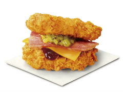 同商品は2012年に日本に「チキンフィレダブル」として初登場して話題に。チキンフィレ(鶏胸肉)一枚肉2枚をバンズ代わりに、その間にスライスしたチェダーチーズとローストしたベーコン、バーベキューソースとマスタードレリッシュを挟んでいます。