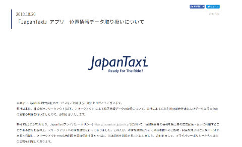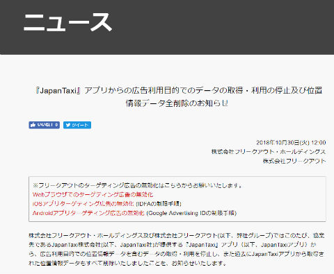 タクシー配車アプリ「JapanTaxi」で、「適切に同意を得ずにユーザーの位置データが収集されている」とSNSで指摘されていた問題について、JapanTaxi社とマーケティング企業フリークアウトは、ユーザーへの説明が不十分であったとして、広告利用目的での位置データを含むデータの取得を停止し、取得済みのデータを破棄したと公表しました。
