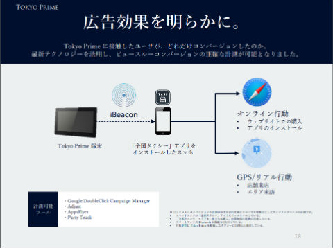 • ユーザーがTokyo Prime搭載のタクシーに乗り、Bluetoothでビーコンを受信した場合に、「Tokyo Primeを見た人のうちどのくらいが広告主のサイトに来訪したのかを広告主に報告」するために使用