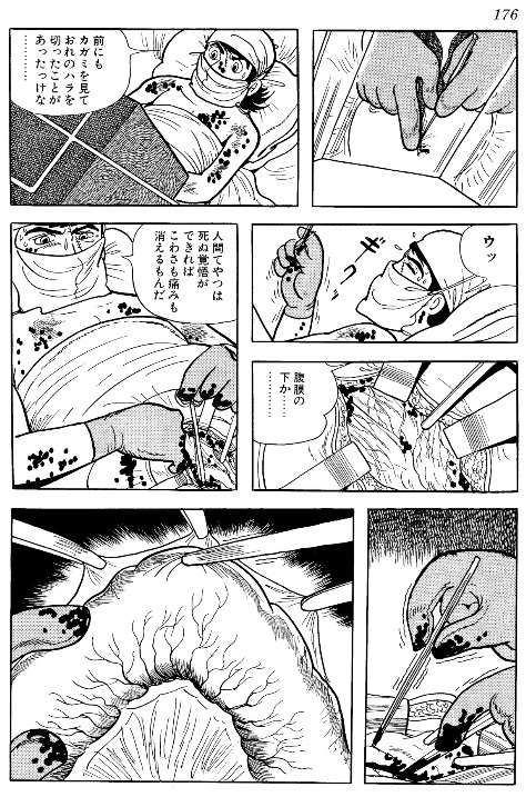 そこで、ブラック・ジャックは、激痛のなか、カガミを使って、自分で自分の手術を開始するのだった。