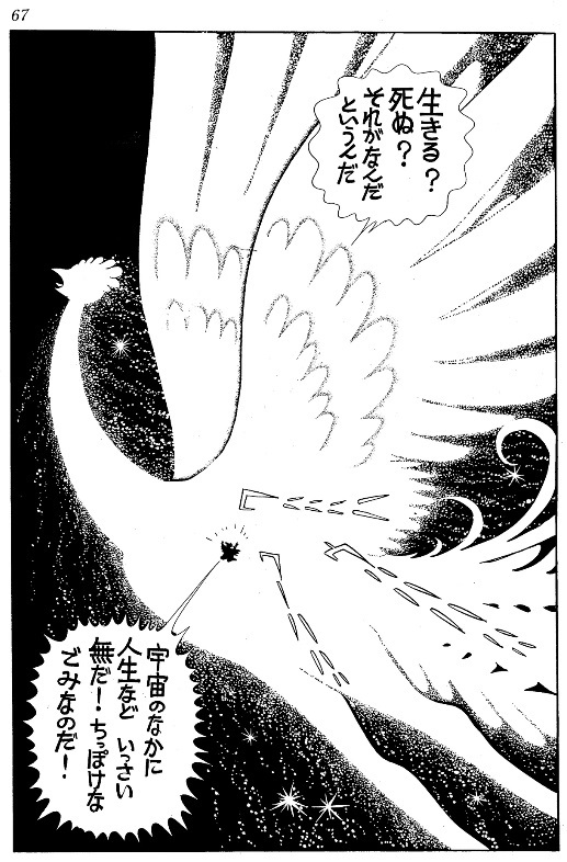 我王「生きる? 死ぬ? それがなんだというんだ 宇宙のなかに人生など いっさい無だ! ちっぽけなごみなのだ!(6巻67ページ)(C)Tezuka Productions