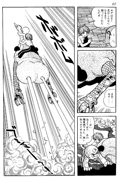 お尻をふくらませガスを噴射して飛ぶモアに乗って大活劇を繰り広げる(4巻62ページ)(C)Tezuka Productions