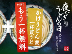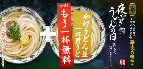 丸亀製麺は11月5〜9日の間、18時から「夜なきうどんの日キャンペーン」を実施。かけうどんを1杯買うともう1杯が無料になります。