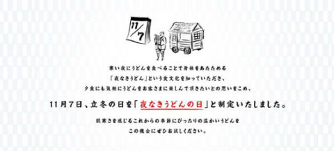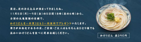 丸亀製麺では立冬の11月7日を「夜なきうどん(寒い夜にうどんを食べることで身体をあたためる文化)の日」と制定。それにちなんだキャンペーンで、対象商品は「かけうどん(並)」(税込290円)。18時から閉店まで(一部店舗では実施なし)。