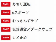 口コミから人気に火が着いた映画「カメラを止めるな!」の略称「カメ止め」に、男性会社員同士の恋愛を描いたドラマ「おっさんずラブ」など、SNSで話題になった作品もいくつか入っている。今年初めてプロライセンス制度ができた「eスポーツ」や、コインチェックからのNEM流出事件が注目を浴びた「仮想通貨/ダークウェブ」など、以前から存在しながらも2018年だからこそ選出された言葉も目立つ。