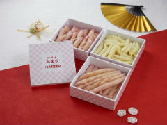 「岩下の新生姜おせち」は3段のお重で、一の重は「岩下の新生姜 80g」、二の重は「岩下プレミアム新芽生姜 120g」、三の重は「岩下プレミアム新生姜 120g」が詰まっています。おショウガつにはぴったりかもしれません、ってやかましいわ。