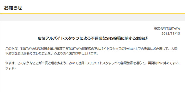 TSUTAYAは11月15日、TSUTAYA荒尾店のアルバイトスタッフがTwitterに投稿した発言について、「大変不適切な表現」であったとして謝罪しました