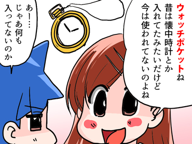 時代の流れで懐中時計を持つ人は少なくなっていますが、他にも“あそこに入れるのにちょうどいいサイズのもの”は意外とあるらしく、「コインポケット」「チケットポケット」などと呼ばれることもあるそうです。