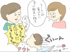 作者の永岡さくら(@saaaaaaaaaaaack)さんの息子さんのりっくんは食欲が旺盛で、ラーメンの話でもしようものなら、今まで遊んでいたおもちゃを放り出してまで「ちゅるちゅるたべりゅ!!!」と食いついてきます。りっくんの食欲を刺激してしまうとアウト。