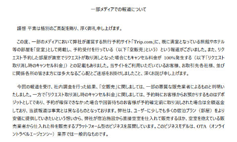 Trip.comは、報道を受けて「当サイトをご利用いただいているお客様、お取引先各社様、並びに関係各所の皆さま方には多大なるご心配とご迷惑をお掛けしましたこと、深くお詫び申し上げます」と謝罪。同サイトでは宿泊施設から直接空室を仕入れて販売する他、空室を抱えている販売業者から仕入れた枠を販売する方式を取っており、一部の悪質な業者が空販売を行っていたことが社内調査により判明したと説明しています。