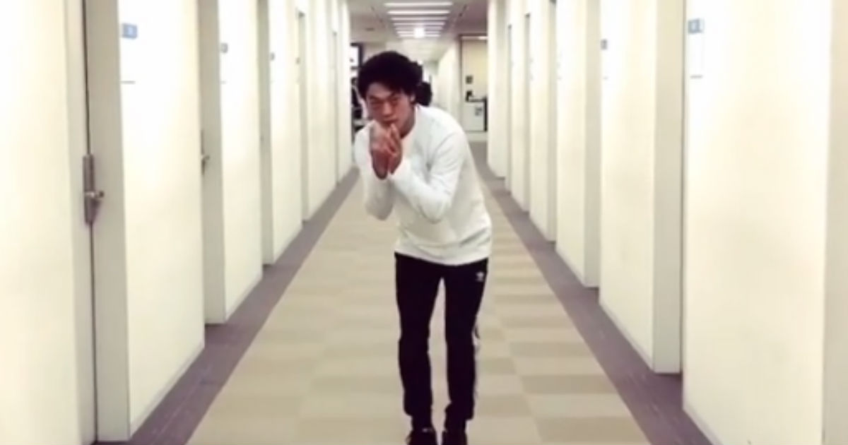 共演した番組の収録終わりに、放送局の廊下で妻に撮影してもらったおばたさん。山崎さんの「プロボウラー、と思ったらバレリーナー」というアナウンサーらしい澄んだ声をバックに、ボウリングの投球スタイルから一転ステップで画面外にはけていくというネタを披露しました。