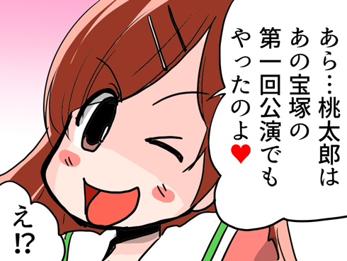 宝塚歌劇の最初の舞台が行われたのは、大正3(1914)年。博覧会の余興として無料公開したもので、その演目は桃太郎の鬼退治をテーマにした「ドンブラコ」「浮かれ達磨(だるま)」などだったとか。今の宝塚歌劇団からはイメージしがたい公演内容ですが、2カ月にわたって上演され、好評を博したといいます。