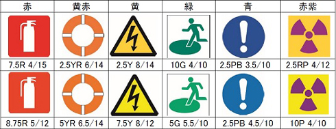同じように、色に関してもJIS規格があって、安全色はその名の通り、「安全に関する注意警告、指示、情報」などを示すのに使われます。具体例を挙げると、立入禁止などの標識や各種信号灯、駅の出口表示、気象情報……と多種多様です。