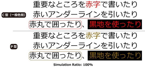 例えば、一般的に“目を引く”と考えられている色が、人によっては“目立たない色”に見えることがあります。「白い紙に黒色で文字などを書き、重要なところを赤色で強調」というのはよくある書き方ですが、ある種の色弱では、濃い赤と黒が似た色に見えるんですね。