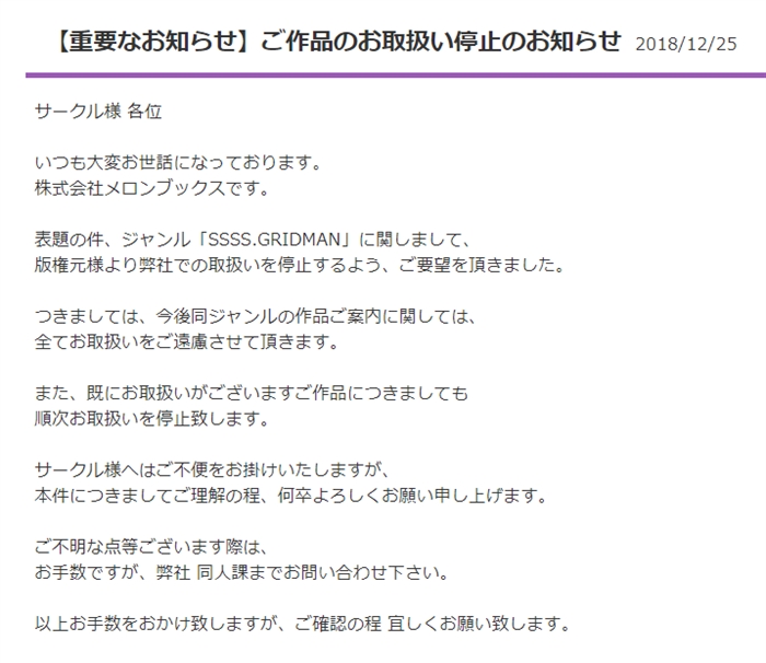 メロンブックスは公式サイト上で12月25日、「SSSS.GRIDMAN」の同人ジャンル取り扱いを停止するよう版権元から要望があったことを明かし、サークル向けに出品をしないよう告知しました。