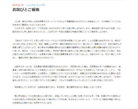 しかし、「短いスカートが性犯罪を誘発」は、指摘を受けた通り被害に遭う側にも非があるとの意味と捉えられると認め、「このような表現を目にされた方々に大変ご不快な思いをさせてしまったことを深くお詫び申し上げます」と謝罪しています。現在掲示しているポスターは回収を進めているとのこと。
