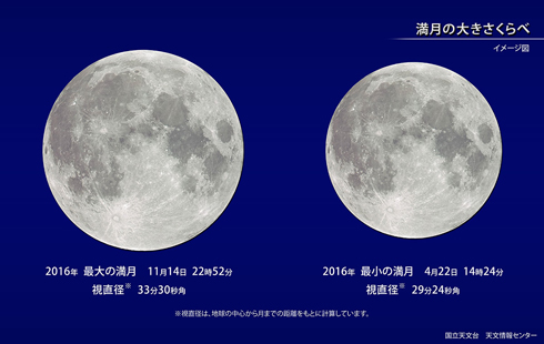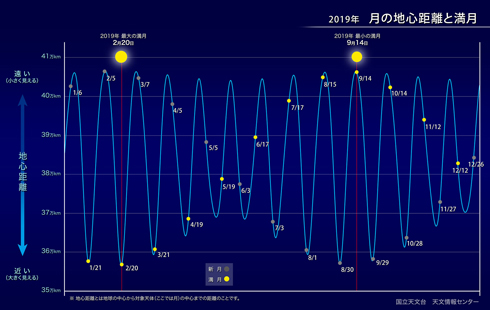 国立天文台によると、2019年で最も大きく満月が見られるのは、2月20日0時54分。反対に、最も小さく見えるのは9月14日13時33分だそうです。