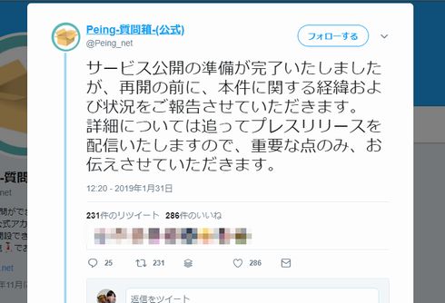 1月28日夜から緊急メンテナンスを繰り返していたWebサービス「Peing-質問箱-」が、30日12時40分にサービスを再開。問題点と改善点を発表しました。