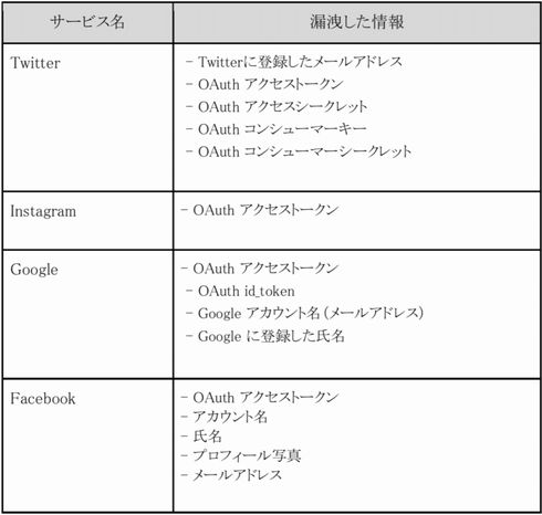 ジラフのプレスリリースによると、「Peing-質問箱-」との連携サービスにおいて今回漏洩した可能性のある情報は、Twitterに登録したメールアドレス、Facebookのアカウント名、氏名、プロフィール写真、メールアドレス、その他各SNSのOAuthアクセストークンなど。