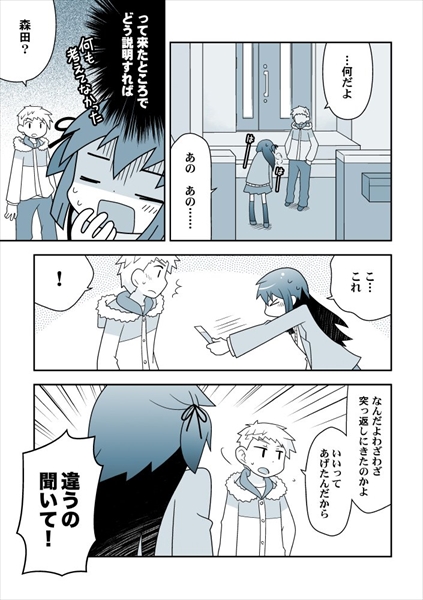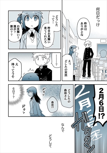 「寝ない日を作ればセーブの回数を節約できる」ことに気づいて実践し始めた森田さん。寝不足でフラフラになりながらも、墨屋くんと映画に行く約束を交わします。しかし寝不足のあまりセーブをしないで寝てしまう大失態。約束を忘れて墨屋くんを怒らせてしまいます。