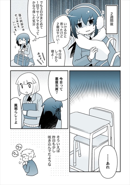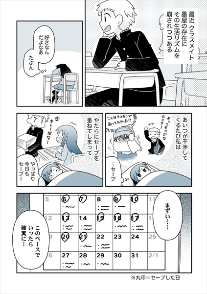 勉強や友達付き合いなどについてはコツを掴んで来ましたが、気になるクラスメイトの男子、墨屋くんのせいで困ったことに。彼と話した日のことを覚えていようとセーブを重ね、セーブ回数が足りなくなりそうになってしまいます。
