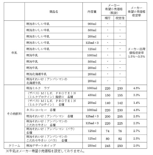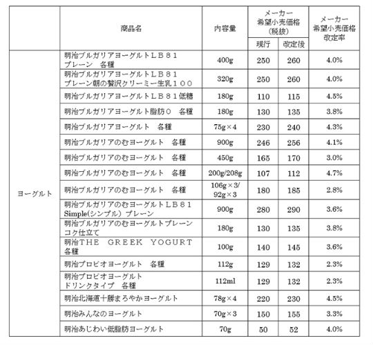 値上げの対象となるのは牛乳、ヨーグルト、乳飲料など111品。牛乳はメーカー出荷価格が1.5〜3.5%、ヨーグルトは希望小売価格が2.3〜4.7%上昇となります。具体的な製品名としては「明治おいしい牛乳」「明治ミルク ラブ」「明治ブルガリアヨーグルト」などが挙げられています。