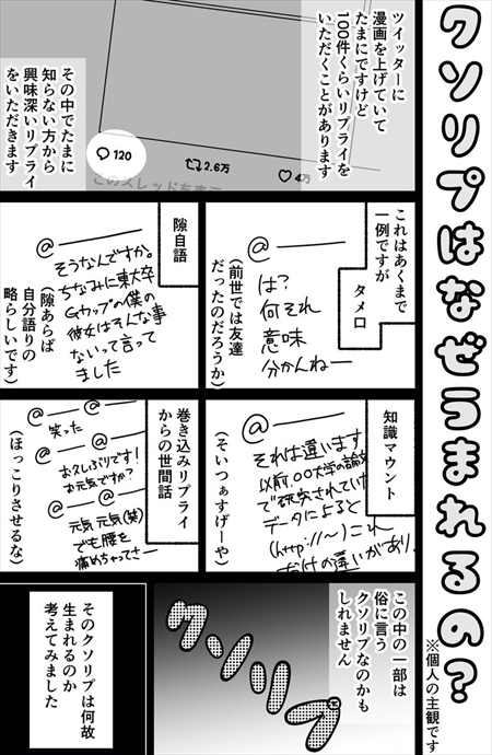 Twitterの投稿者を不快な気持ちにさせるリプライ、いわゆる“クソリプ”が、なぜ生まれるのかを考察した漫画が反響を集めています。